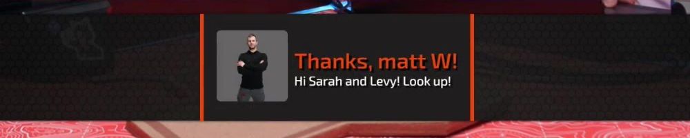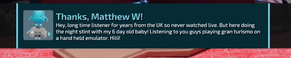 Thanks, Matthew W! Hey, long time listener for years from the UK so never watched live. But here doing the night stint with my 6 day old baby! Listening to you guys playing gran turismo on a hand held emulator. Hiiii!