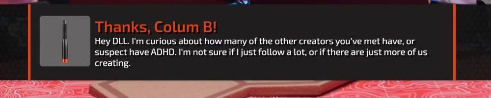 Thanks, Colum B! Hey DLL. I'm curious about how many of the other creators you've met have, or suspect have ADHD. I'm not sure if I just follow a lot, or if there are just more of us creating.