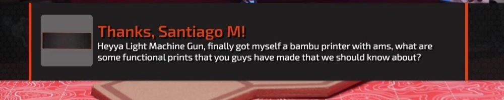 Thanks, Santiago M! Heyya Light Machine Gun, finally got myself a bambu printer with ams, what are some functional prints that you guys have made that we should know about?
