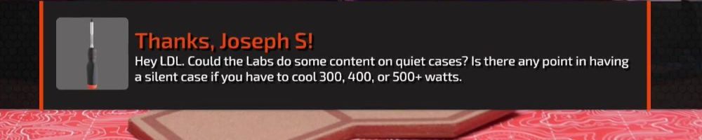 Thanks, Joseph S! Hey LDL. Could the Labs do some content on quiet cases? Is there any point in having a silent case if you have to cool 300, 400, or 500+ watts.