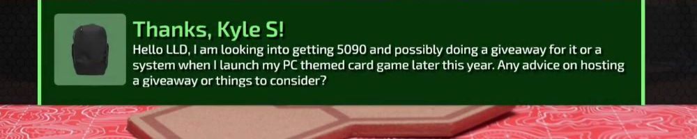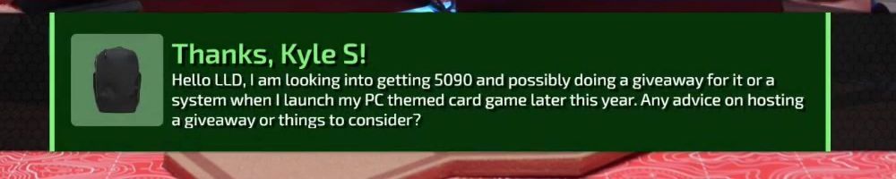 Thanks, Kyle S! Hello LLD, I am looking into getting 5090 and possibly doing a giveaway for it or a system when I launch my PC themed card game later this year. Any advice on hosting a giveaway or things to consider?