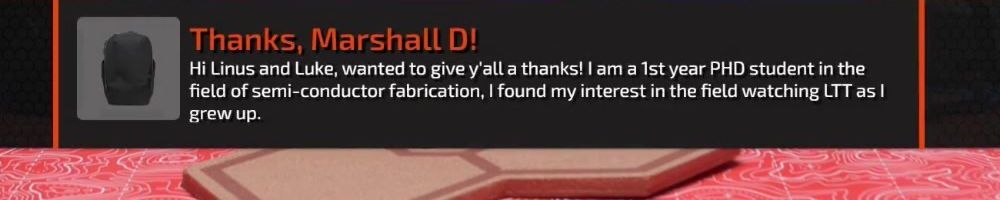 Thanks, Marshall D! Hi Linus and Luke, wanted to give y'all a thanks! I am a 1st year PHD student in the field of semi-conductor fabrication, I found my interest in the field watching LTT as I grew up.
