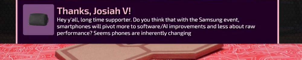 Thanks, Josiah V! Hey y'all, long time supporter. Do you think that with the Samsung event, smartphones will pivot more to software/AI improvements and less about raw performance? Seems phones are inherently changing