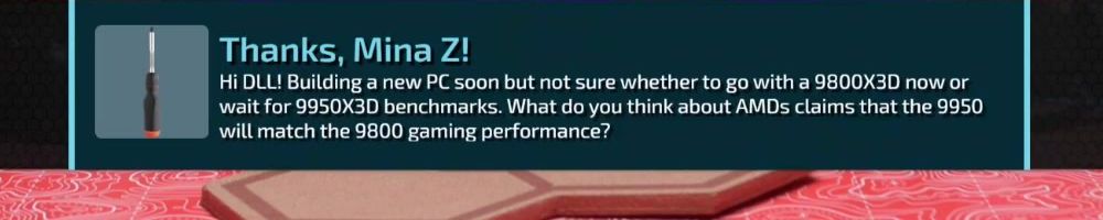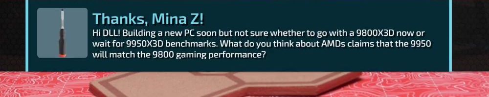 Thanks, Mina Z! Hi DLL! Building a new PC soon but not sure whether to go with a 9800X3D now or wait for 9950X3D benchmarks. What do you think about AMDs claims that the 9950 will match the 9800 gaming performance?