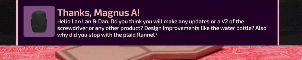 Thanks, Magnus A! Hello Lan Lan & Dan. Do you think you will make any updates or a V2 of the screwdriver or any other product? Design improvements like the water bottle? Also why did you stop with the plaid flannel?