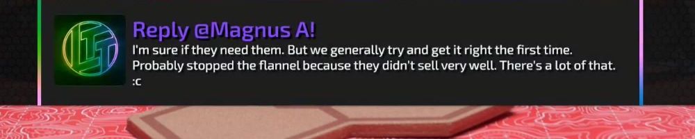 Reply @Magnus A! I'm sure if they need them. But we generally try and get it right the first time. Probably stopped the flannel because they didn't sell very well. There's a lot of that. :c
