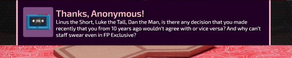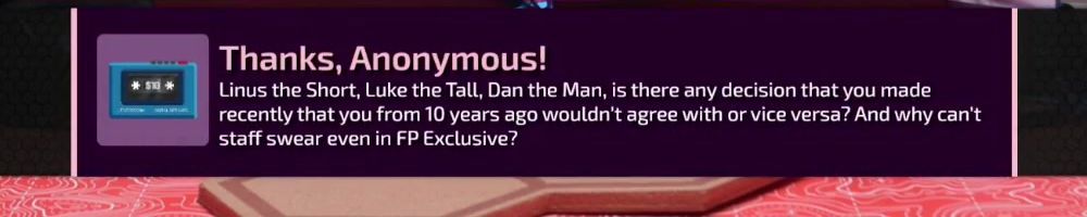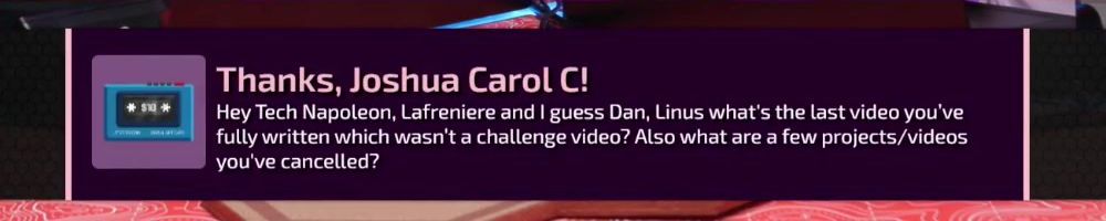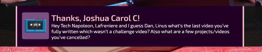 Thanks, Joshua Carol C! Hey Tech Napoleon, Lafreniere and I guess Dan, Linus what's the last video you've fully written which wasn't a challenge video? Also what are a few projects/videos you've cancelled?