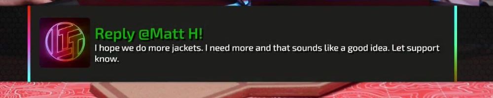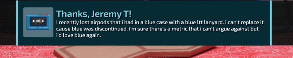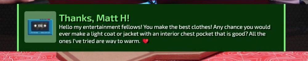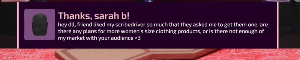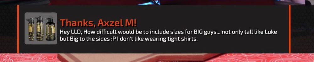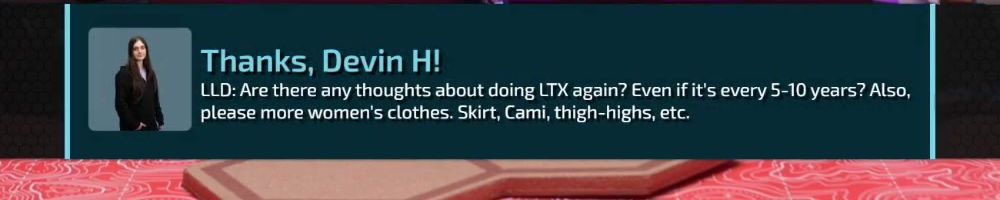 Thanks, Devin H! LLD: Are there any thoughts about doing LTX again? Even if it's every 5-10 years? Also, please more women's clothes. Skirt, Cami, thigh-highs, etc.