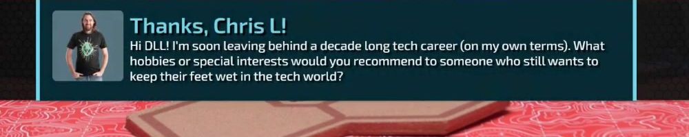 Thanks, Chris L! Hi DLL! I'm soon leaving behind a decade long tech career (on my own terms). What hobbies or special interests would you recommend to someone who still wants to keep their feet wet in the tech world?