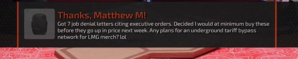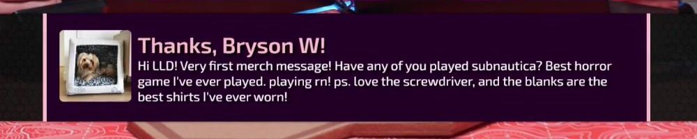 Thanks, Bryson W! Hi LLD! Very first merch message! Have any of you played subnautica? Best horror game I've ever played. playing rn! ps. love the screwdriver, and the blanks are the best shirts I've ever worn!