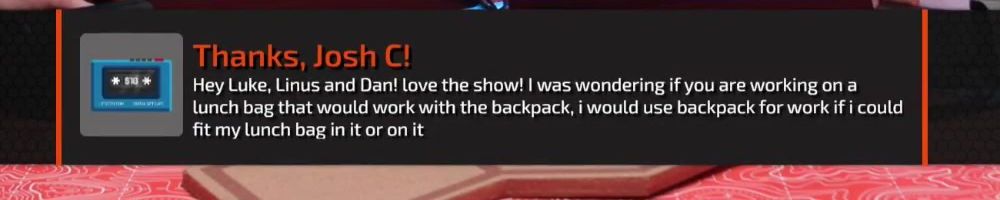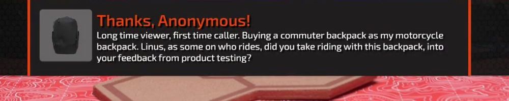 Thanks, Anonymous! Long time viewer, first time caller. Buying a commuter backpack as my motorcycle backpack. Linus, as some on who rides, did you take riding with this backpack, into your feedback from product testing?