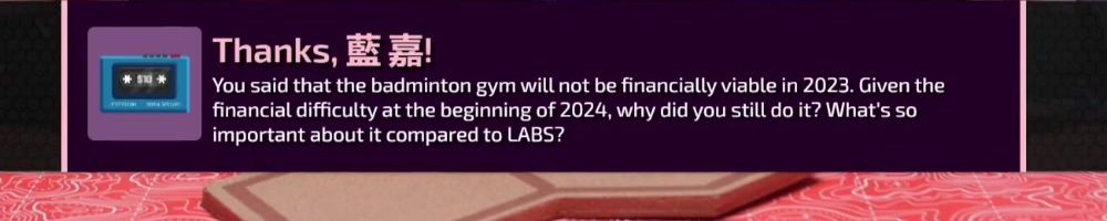 Thanks, 藍嘉! You said that the badminton gym will not be financially viable in 2023. Given the financial difficulty at the beginning of 2024, why did you still do it? What's so important about it compared to LABS?