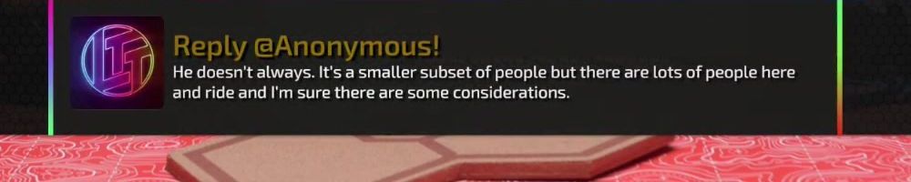 Reply @Anonymous! He doesn't always. It's a smaller subset of people but there are lots of people here and ride and I'm sure there are some considerations.