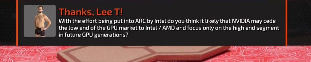 Thanks, Lee T! With the effort being put into ARC by Intel do you think it likely that NVIDIA may cede the low end of the GPU market to Intel / AMD and focus only on the high end segment in future GPU generations?