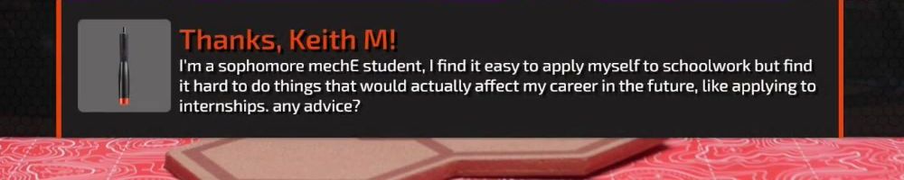 Thanks, Keith M! I'm a sophomore mechE student, I find it easy to apply myself to schoolwork but find it hard to do things that would actually affect my career in the future, like applying to internships. any advice?