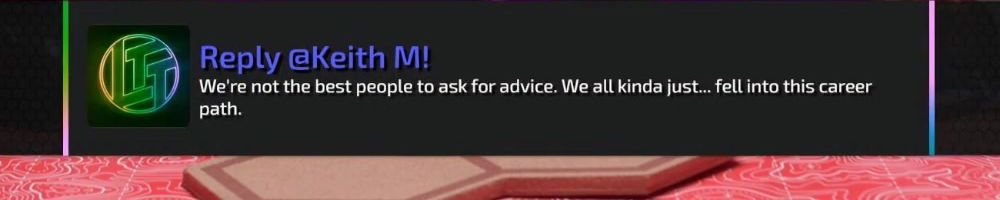 Reply @Keith M! We're not the best people to ask for advice. We all kinda just... fell into this career path.