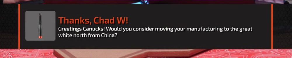 Thanks, Chad W! Greetings Canucks! Would you consider moving your manufacturing to the great white north from China?