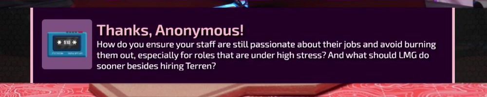 Thanks, Anonymous! How do you ensure your staff are still passionate about their jobs and avoid burning them out, especially for roles that are under high stress? And what should LMG do sooner besides hiring Terren?