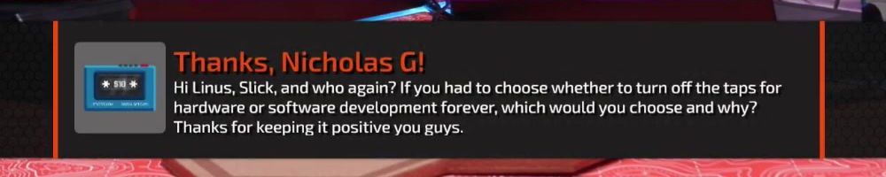Thanks, Nicholas G! Hi Linus, Slick, and who again? If you had to choose whether to turn off the taps for hardware or software development forever, which would you choose and why? Thanks for keeping it positive you guys.