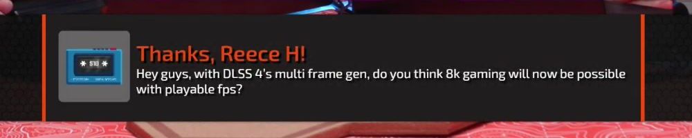 Thanks, Reece H! Hey guys, with DLSS 4's multi frame gen, do you think 8k gaming will now be possible with playable fps?