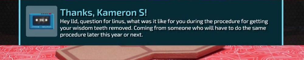 Thanks, Kameron S! Hey Ld, question for linus, what was it like for you during the procedure for getting your wisdom teeth removed. Coming from someone who will have to do the same procedure later this year or next.