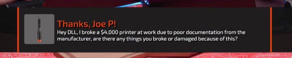 Thanks, Joe P! Hey DLL, I broke a $4,000 printer at work due to poor documentation from the manufacturer, are there any things you broke or damaged because of this?