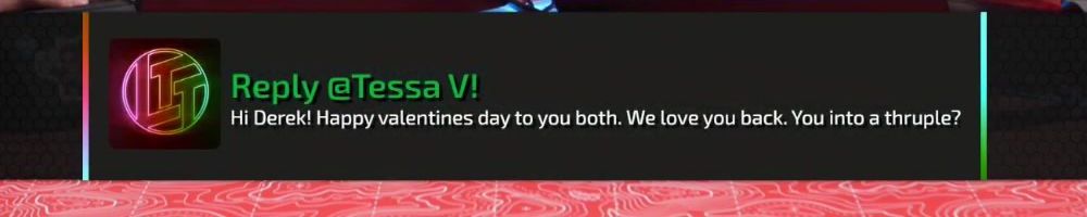 Reply @Tessa V! Hi Derek! Happy valentines day to you both. We love you back. You into a thruple?