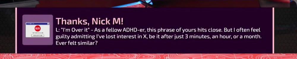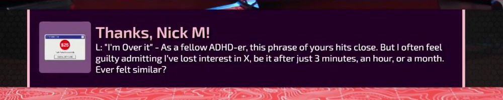 Thanks, Nick M! L: "I'm Over it" - As a fellow ADHD-er, this phrase of yours hits close. But I often feel guilty admitting I've lost interest in X, be it after just 3 minutes, an hour, or a month. Ever felt similar?