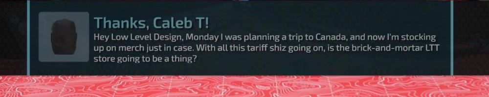 Thanks, Caleb T! Hey Low Level Design, Monday | was planning a trip to Canada, and now I'm stocking up on merch just in case. With all this tariff shiz going on, is the brick-and-mortar LTT store going to be a thing?