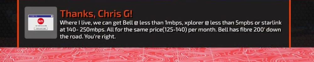 Thanks, Chris G! Where I live, we can get Bell @ less than 1mbps, xplorer @ less than 5mpbs or starlink at 140- 250mbps. All for the same price(125-140) per month. Bell has fibre 200' down the road. You're right.