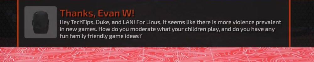 Thanks, Evan W! Hey TechTips, Duke, and LAN! For Linus, It seems like there is more violence prevalent in new games. How do you moderate what your children play, and do you have any fun family friendly game ideas?