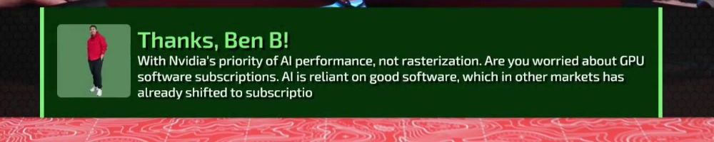 Thanks, Ben B! With Nvidia's priority of AI performance, not rasterization. Are you worried about GPU software subscriptions. AI is reliant on good software, which in other markets has already shifted to subscription