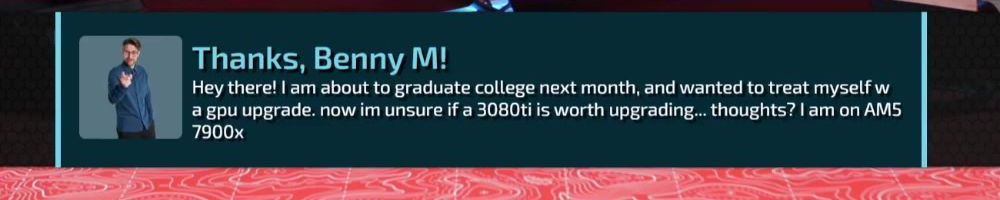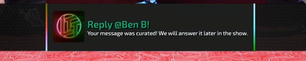 Reply @Ben B! Your message was curated! We will answer it later in the show.