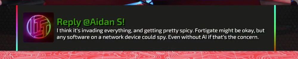 Reply @Aidan S! I think it's invading everything, and getting pretty spicy. Fortigate might be okay, but any software on a network device could spy. Even without AI if that's the concern.