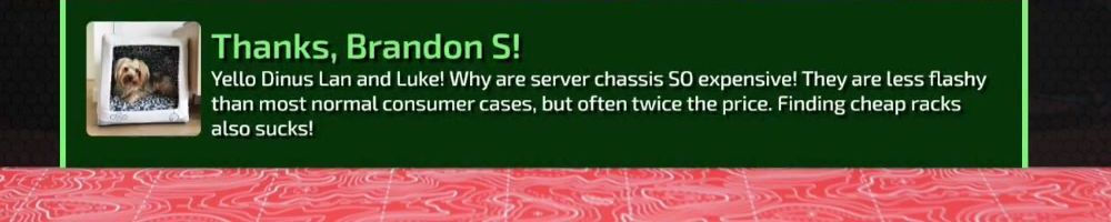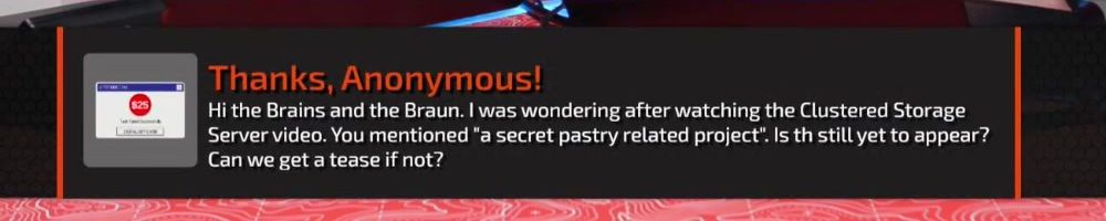 Thanks, Anonymous! Hi the Brains and the Braun. I was wondering after watching the Clustered Storage Server video. You mentioned "a secret pastry related project". Is it still yet to appear? Can we get a tease if not?