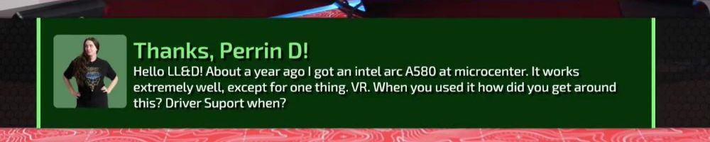 Thanks, Perrin D! Hello LL&D! About a year ago I got an intel arc A580 at microcenter. It works extremely well, except for one thing. VR. When you used it how did you get around this? Driver Support when?