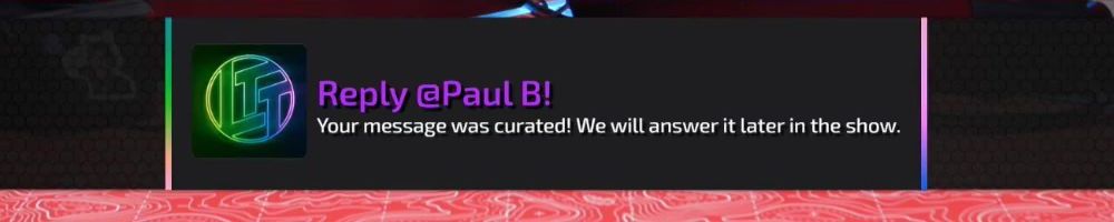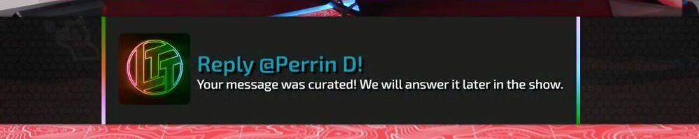 Reply @Perrin D! Your message was curated! We will answer it later in the show.