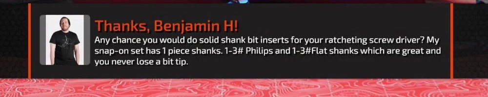 Thanks, Benjamin H! Any chance you would do solid shank bit inserts for your ratcheting screw driver? My snap-on set has 1 piece shanks. 1-3# Philips and 1-3#Flat shanks which are great and you never lose a bit tip.