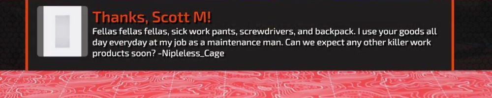 Thanks, Scott M! Fellas fellas fellas, sick work pants, screwdrivers, and backpack. I use your goods all day everyday at my job as a maintenance man. Can we expect any other killer work products soon? -Nipleless_Cage