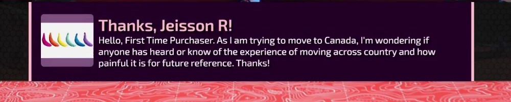 Thanks, Jeisson R! Hello, First Time Purchaser. As I am trying to move to Canada, I'm wondering if anyone has heard or know of the experience of moving across country and how painful it is for future reference. Thanks!