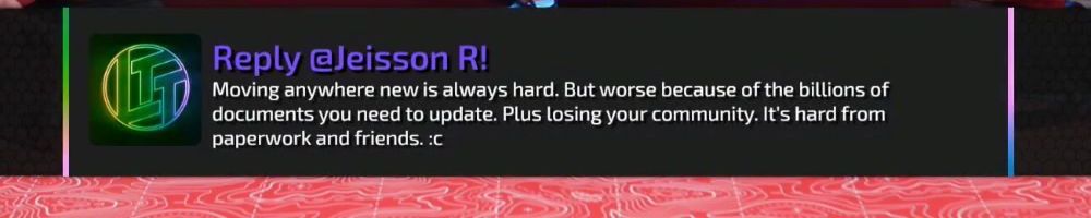 Reply @Jeisson R! Moving anywhere new is always hard. But worse because of the billions of documents you need to update. Plus losing your community. It's hard from paperwork and friends. :c