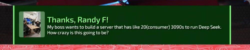 Thanks, Randy F! My boss wants to build a server that has like 20(consumer) 3090s to run Deep Seek. How crazy is this going to be?