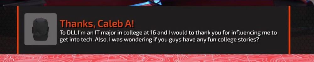 Thanks, Caleb A! To DLL I'm an IT major in college at 16 and I would to thank you for influencing me to get into tech. Also, I was wondering if you guys have any fun college stories?