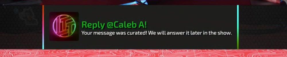 Reply @Caleb A! Your message was curated! We will answer it later in the show.