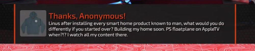 Thanks, Anonymous! Linus after installing every smart home product known to man, what would you do differently if you started over? Building my home soon. PS floatplane on AppleTV when?!? I watch all my content there.