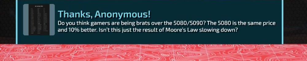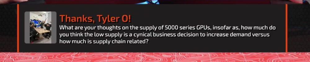 Thanks, Tyler O! What are your thoughts on the supply of 5000 series GPUs, insofar as, how much do you think the low supply is a cynical business decision to increase demand versus how much is supply chain related?