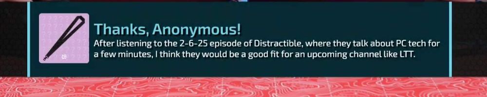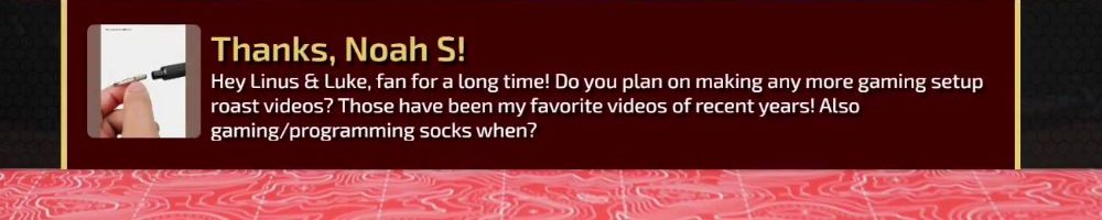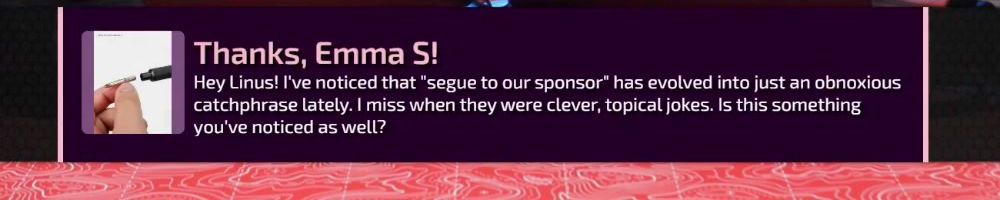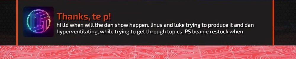 Thanks, Rielly C! How can we get Dan to do the ad read, Luke explains merch messages, & Linus produces.