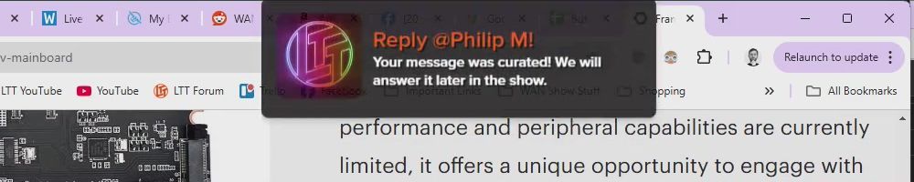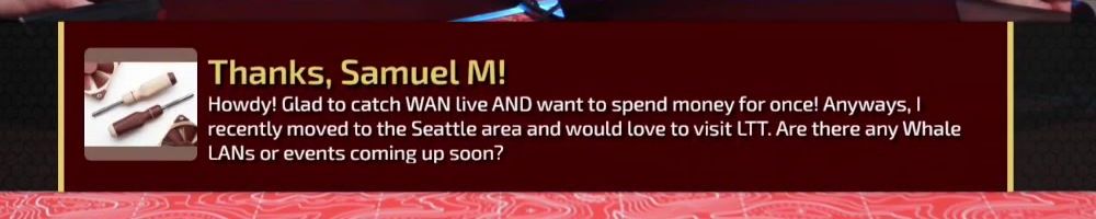 Thanks, Samuel M! Howdy! Glad to catch WAN live AND want to spend money for once! Anyways, I recently moved to the Seattle area and would love to visit LTT. Are there any Whale LANs or events coming up soon?