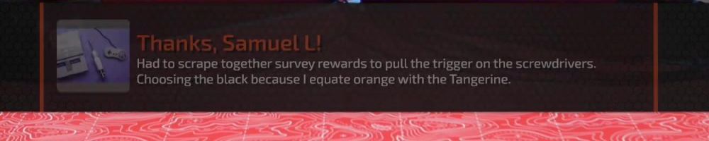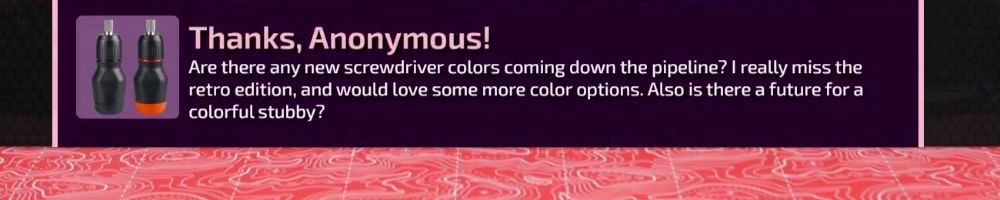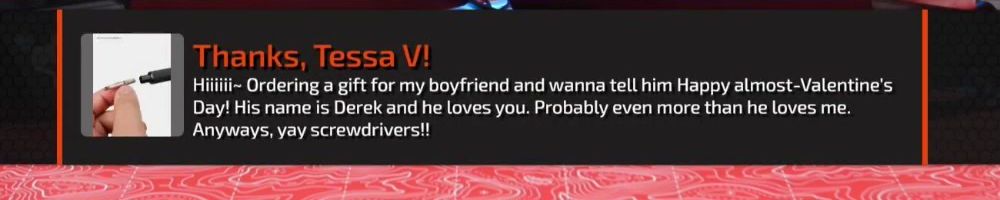 Thanks, Tessa V! Hiiiii~ Ordering a gift for my boyfriend and wanna tell him Happy almost-Valentine's Day! His name is Derek and he loves you. Probably even more than he loves me. Anyways, yay screwdrivers!!