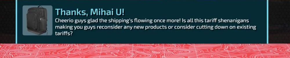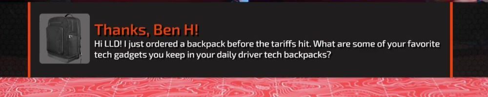 Thanks, Ben H! Hi LLD! I just ordered a backpack before the tariffs hit. What are some of your favorite tech gadgets you keep in your daily driver tech backpacks?